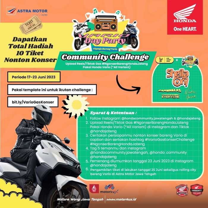 Khusus untuk Honda Community Jateng, 10 tiket konser gratis juga akan dibagikan kepada 10 bikers beruntung yang berhasil memenangkan challenge, namun peserta wajib follow IG @hondacommunity.jawatengah dan tergabung dalam member HCID. Untuk informasi lebih lengkapnya dapat dilihat di IG @hondacommunity.jawatengah.(ris)