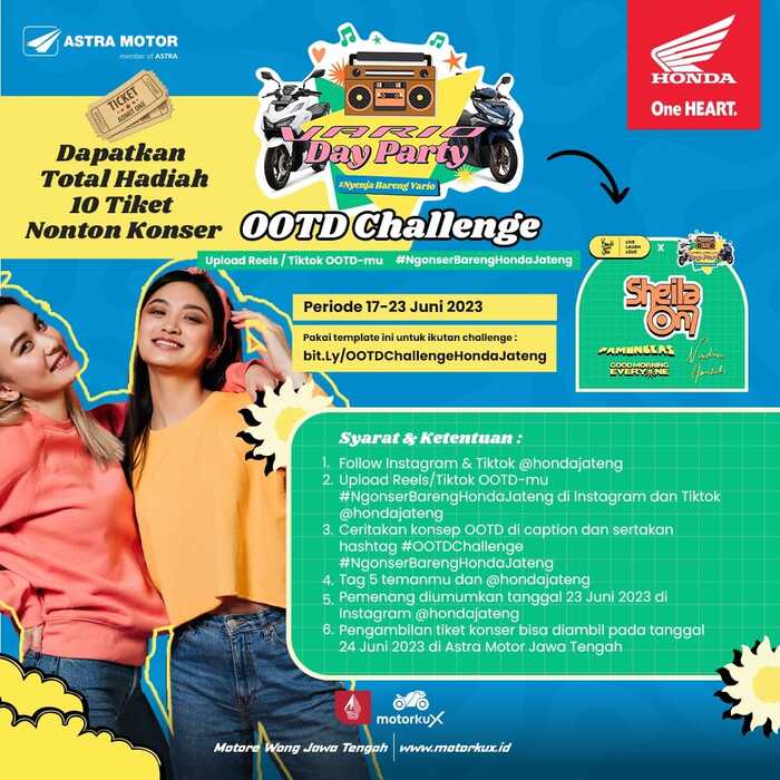 Challenge yang diangkat ini pun cukup mudah, peserta cukup memfollow IG dan Tiktok @hondajateng, gunakan template bit.ly/OOTDChallengeHondaJateng, upload video reels/tiktok OOTD terbaikmu dan tulis caption menarik, tag hondajateng dan 5 temanmu, periode challenge ini mulai 17 – 23 Juni 2023.