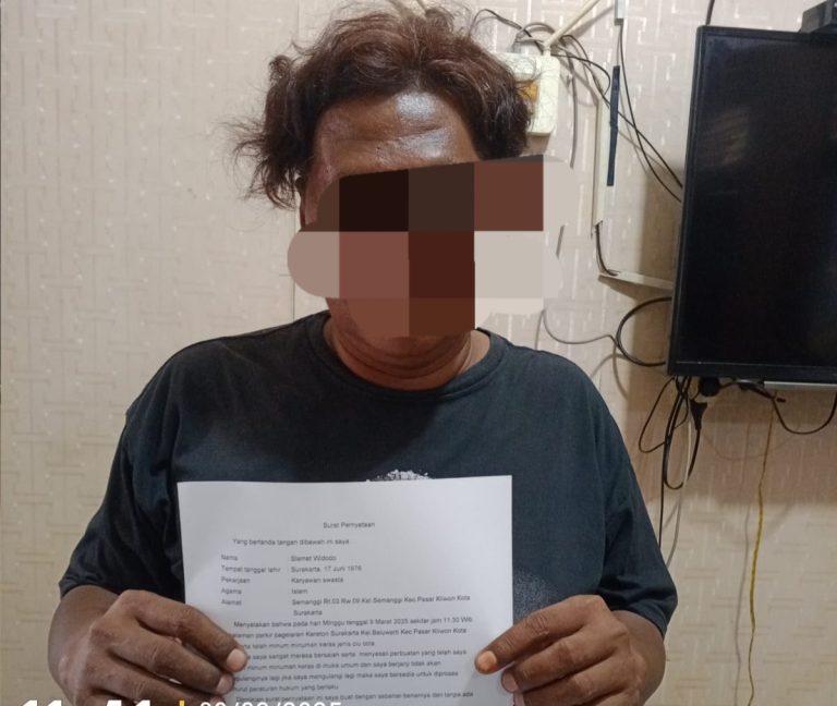 METROJATENG.COM, SURAKARTA – Seorang pria berinisial SW (49) yang kedapatan sedang mengonsumsi minuman keras (miras) di siang hari saat umat muslim menjalankan ibadah puasa, diamankan oleh Tim Opsnal Unit Reskrim Polsek Pasar Kliwon Polresta Surakarta. Peristiwa tersebut terjadi pada hari Minggu, (9/3/2025), di halaman Pagelaran Keraton Surakarta.