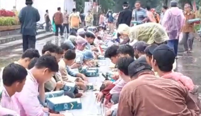 Dengan cuaca yang sedikit mendung dan rintik hujan, ribuan peserta tetap semangat mengikuti acara yang menghadirkan hidangan khas buka puasa, seperti nasi putih, ayam goreng, telur rebus, sayuran, kurma, dan sosis solo. Para peserta terlihat duduk rapi sepanjang area pedestrian di luar dan dalam stadion.