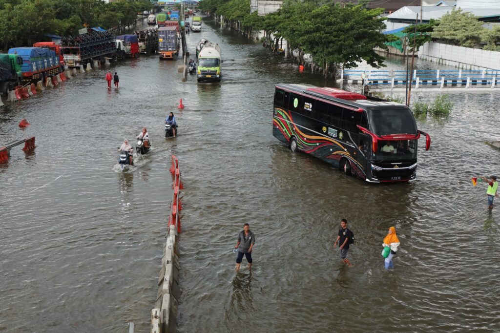 METROJATENG.COM, SEMARANG – Jalur Pantura di kawasan Kaligawe, Kecamatan Genuk, Semarang masih porak-poranda oleh banjir yang tak kunjung minggat. Sabtu (25/10/2025) menandai hari keempat genangan menutup salah satu jalur logistik paling vital di Jawa Tengah. Kendaraan terpaksa merayap atau bahkan memutar jauh, sementara aktivitas distribusi barang terancam melambat.